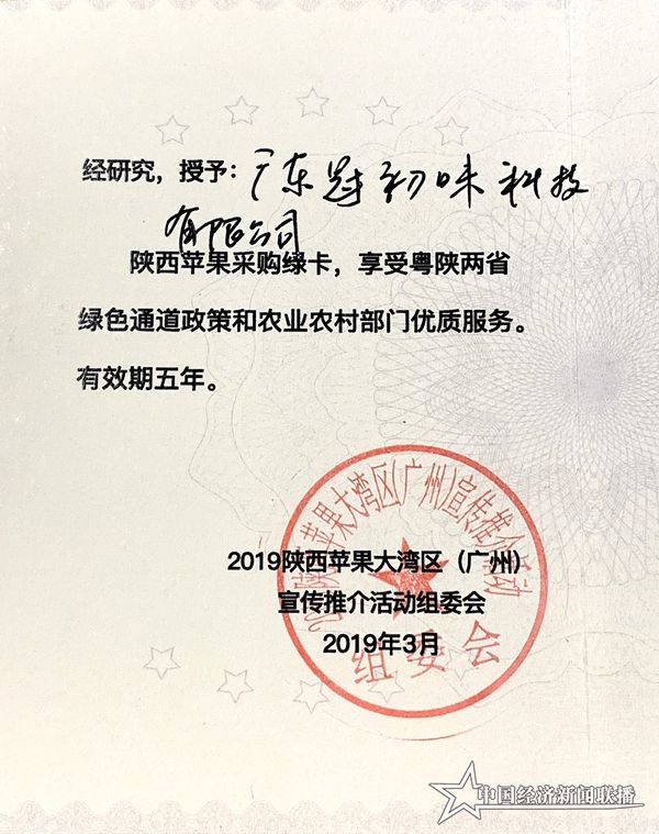 廣東冠初味喜獲陜西蘋果采購(gòu)“綠卡”