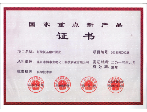 湛江博泰生物化工科技實(shí)業(yè)有限公司所研發(fā)生產(chǎn)的蝦肽氨基酸,是由28種動(dòng)物源(蝦頭蝦殼)活性氨基酸富含甲殼素、殼聚糖、殼寡糖、蝦特有的蝦腦磷脂、蝦紅素、活性鈣,氨基酸絡(luò)合的鎂、鐵、鋅、銅等中微量元素構(gòu)成的一種有機(jī)營(yíng)養(yǎng)免疫劑。由于蝦肽系列產(chǎn)品在種植過(guò)程中的特殊表現(xiàn),得到了廣大種植戶的強(qiáng)烈認(rèn)可。并在2013年9月被國(guó)家4部委聯(lián)合授予湛江博泰蝦肽肥為國(guó)家重點(diǎn)新產(chǎn)品證書。