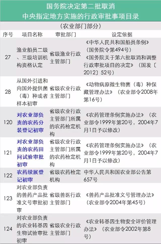 圖為 國務(wù)院決定第二批取消中央指定地方實施的行政審批事項目錄(農(nóng)業(yè)部門部分)