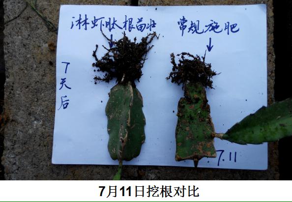 2、施用蝦肽酸性土壤調理液+根苗壯后,試驗區(qū)的火龍果的根部比對照區(qū)生長得更長、更粗壯,莖條比對照區(qū)生長更快(一個星期平均多長5cm左右)。原來停止生長的火龍果也開始生長伸長。