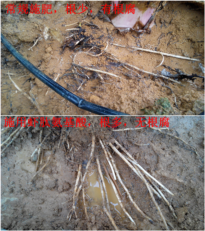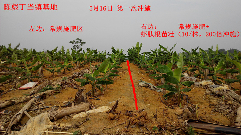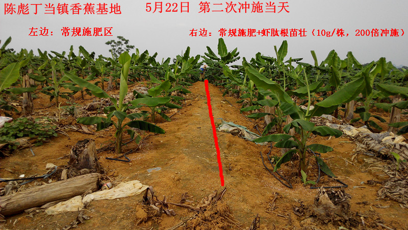 試驗(yàn)方法:對(duì)同一地點(diǎn)分別同時(shí)對(duì)香蕉施加常規(guī)肥料和蝦肽根苗壯,觀察香蕉的生長(zhǎng)情況和根部的觀察。