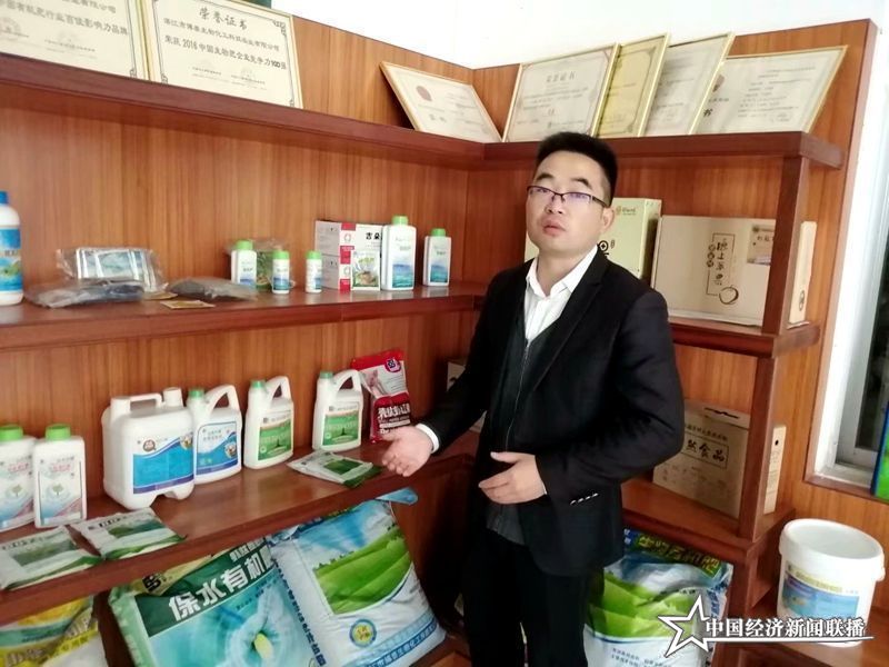 (湛江市博泰生物公司產(chǎn)品部負責(zé)人詹少波給記者介紹土壤調(diào)理劑系列產(chǎn)品的情況)
