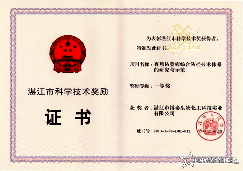 博泰公司通過多次試驗,采用抗病品種+施用蝦肽肥+栽培技術(shù)綜合治理措施,使素有“植物癌癥”之稱的香蕉枯萎病發(fā)病率在控制在4%以下,使香蕉枯萎病疫區(qū)的香蕉獲得意想不到的大豐收。由于該綜合防控技術(shù)系統(tǒng)的研究及推廣對我國香蕉枯萎病的防治意義重大,經(jīng)濟效益和社會效益顯著,于2013年香蕉枯萎病綜合防控技術(shù)體系的研究與示范獲得湛江市科學(xué)技術(shù)一等獎(如下圖)。