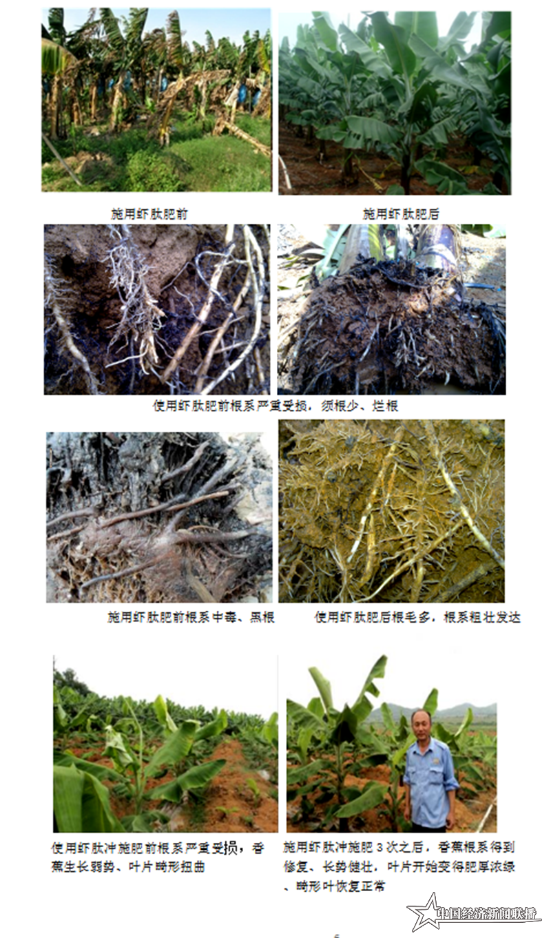 詹少波說,在2012-2013年期間,由廣東海洋大學(xué)與湛江博泰公司共同組織蝦肽氨基酸系列肥料在湛江市徐聞現(xiàn)代化農(nóng)業(yè)公司的香蕉基地對其香蕉枯萎病的應(yīng)用試驗,效果非常顯著。當(dāng)時發(fā)病較早的植株不能抽蕾,病株抽蕾后蕉果發(fā)育不全,大部分病株凋萎倒垂,通過博泰公司技術(shù)指導(dǎo),選用抗病的香蕉品種,施用蝦肽氨基酸系列肥提高香蕉的抗病蟲害的能力,使香蕉生長旺盛,再配合施用蝦肽肥保根防病栽培技術(shù)對香蕉根系根結(jié)線蟲有非常好的防治效果,使根系的生長好、根壯、須根多。香蕉生長好,長勢齊整,蕉葉厚綠,發(fā)病少,且香蕉枯萎病病情指數(shù)較低,病株仍然可以抽出正常蕉果,產(chǎn)量有了很大提高。