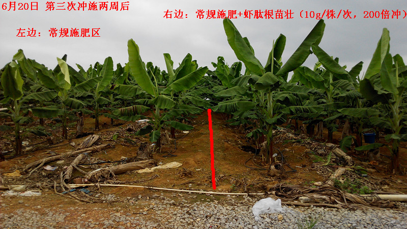 2015年5月到6月, 為了有效驗證蝦肽系列肥料和常規(guī)肥料對植物生長的影響,我們在廣西南寧隆安縣丁當(dāng)鎮(zhèn)陳彪基地分別同時對香蕉施加常規(guī)肥料和蝦肽根苗壯,觀察香蕉的生長情況和根部的觀察,結(jié)果證明,使用了蝦肽根苗壯的香蕉葉子粗壯,生長旺盛,效果相當(dāng)明顯。